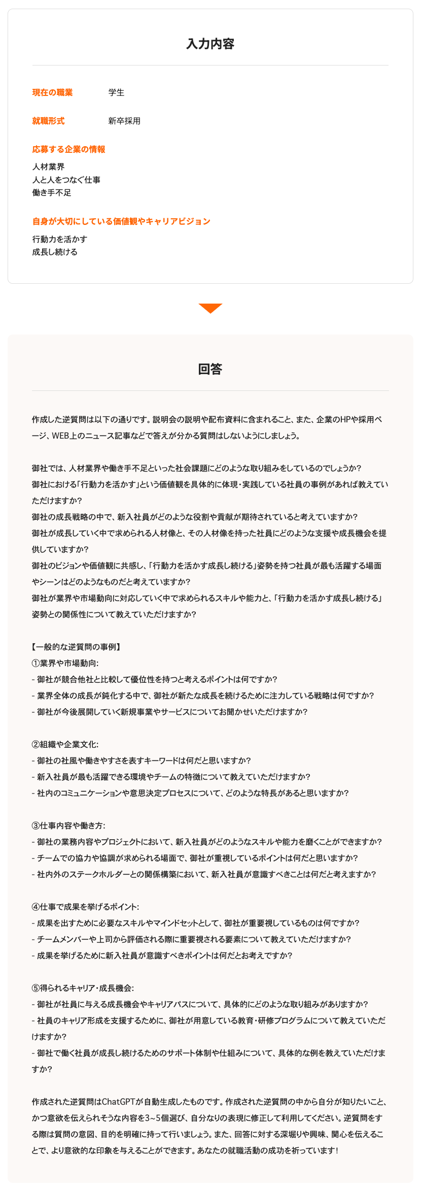 面接で大事な「逆質問」。企業の特徴や志望動機、就活の軸などを入れることでオリジナルな逆質問を作成できます。意思決定の参考になる企業情報をヒアリングする、また、自分の意欲などをアピールする機会です。